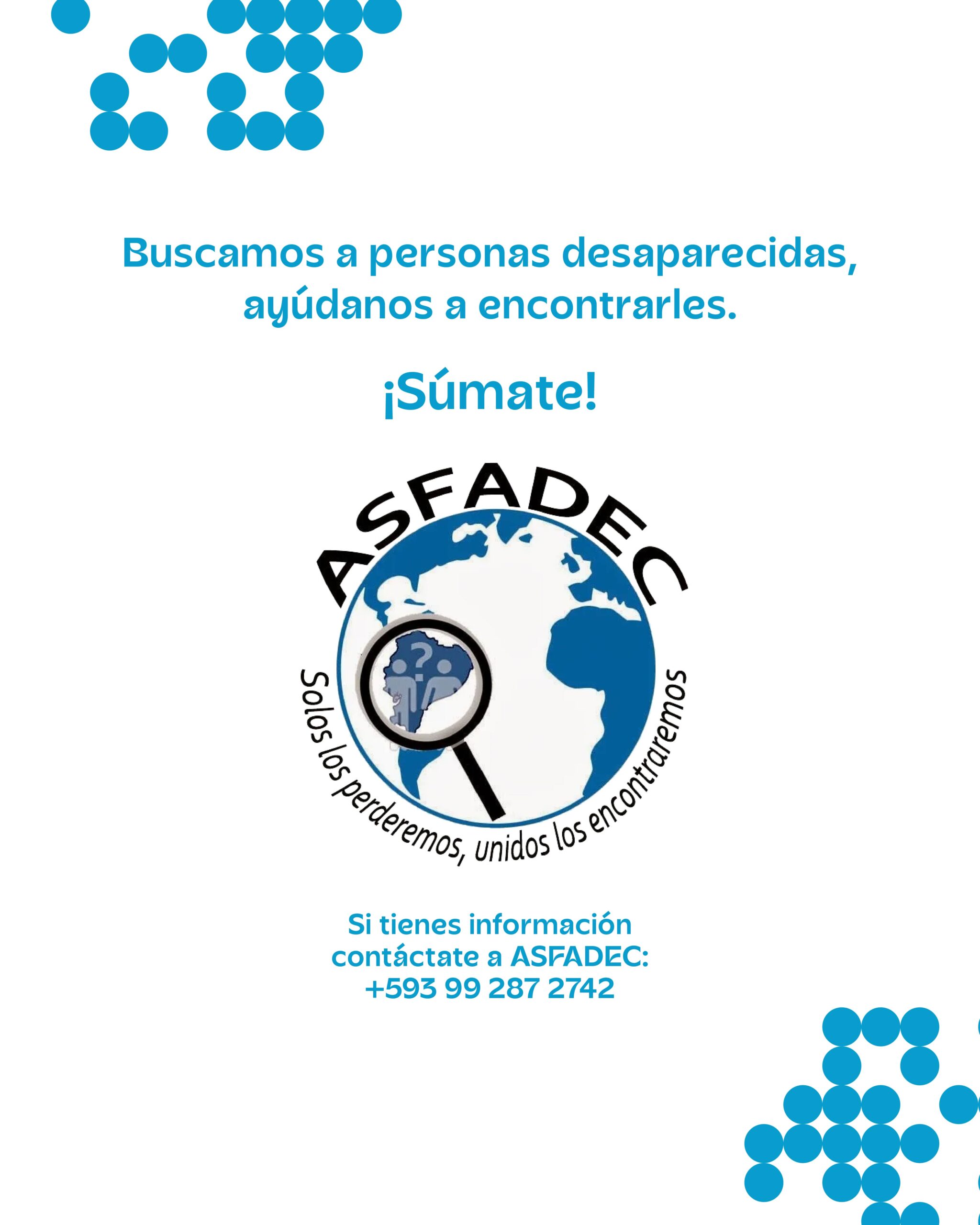 La Asociación de Familiares y Amigos de Personas Desaparecidas en Ecuador (Asfadec) es una organización sin fines de lucro que nace en 2012 de la necesidad de unir los esfuerzos de los familiares, allegados y amigos para encontrar a los desaparecidos. Centenares de personas desaparecen en Ecuador cada año, pero no existe una verdadera búsqueda e investigación por parte de los organismos del Estado ecuatoriano para encontrarlas/os.