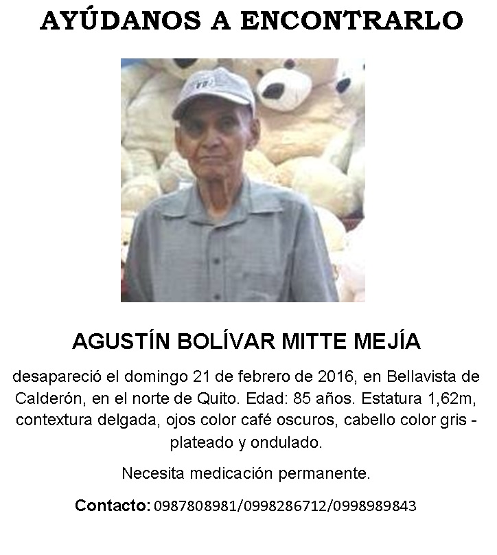 años de edad, desapareció el domingo pasado, 21 de febrero de 2016, en el sector de Bellavista de Calderón, en el norte de Quito.