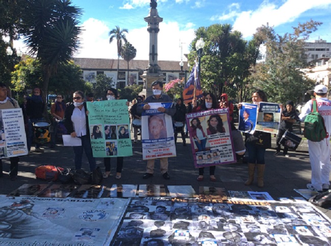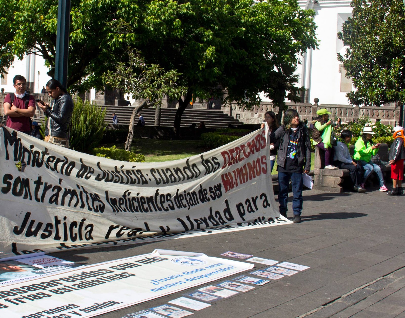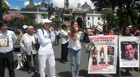 El día 30 de junio de 2016 realizamos un plantón de concientización y sensibilización acerca de la problemática de los desaparecidos en Ecuador. A la vez nos manifestamos al considerar que las reuniones entre el Presidente Correa y algunos familiares son un espacio revictimizante, falto de operatividad y en el que algunas instituciones, pese toda evidencia, insisten en demostrar una efectividad e idoneidad, la mayoría de veces inexistente. Desde enero de 2013 a diciembre de 2015 se registran 1.714 casos en investigación.