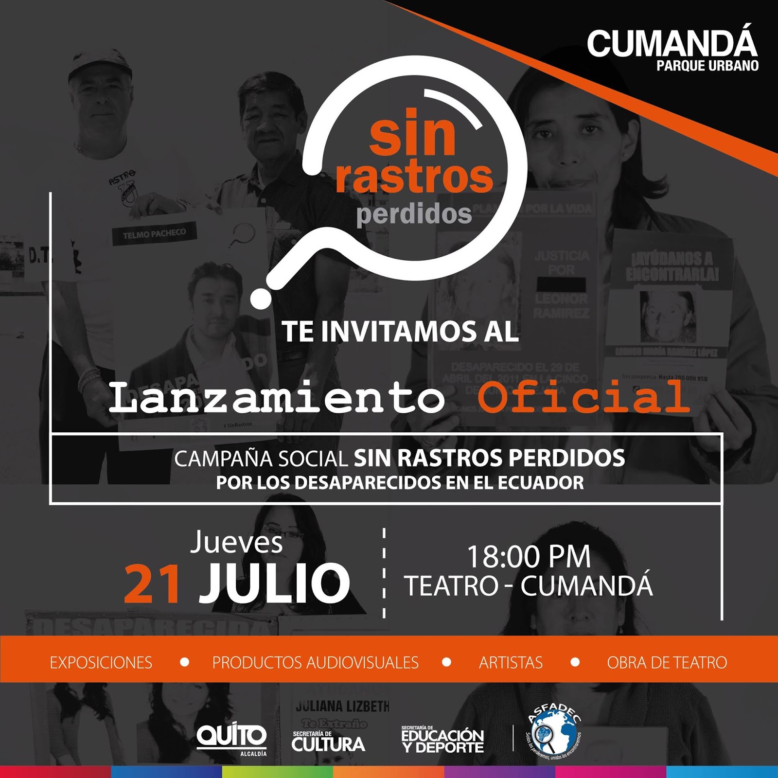 Eric Orbe, la Asociación de Familiares y Amigos de Personas Desaparecidas en Ecuador y el Parque Cumandá invita a los medios de comunicación y a la sociedad al lanzamiento de la campaña Sin Rastros Perdidos que tiene como slogan Tu indiferencia es un rastro perdido que se presentará este jueves 21 de julio de 2016, a las 18:00, en el Teatro Parque Urbano Cumandá, en la ciudad de Quito.