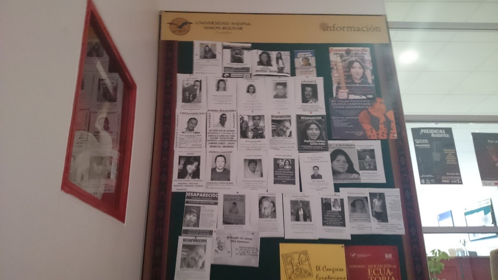 Las fotografías con los rostros de las personas que no han retornado a casa se exponen en el séptimo piso del edificio José Joaquín de Olmedo de la Universidad Andina Simón Bolívar, en el norte de Quito.