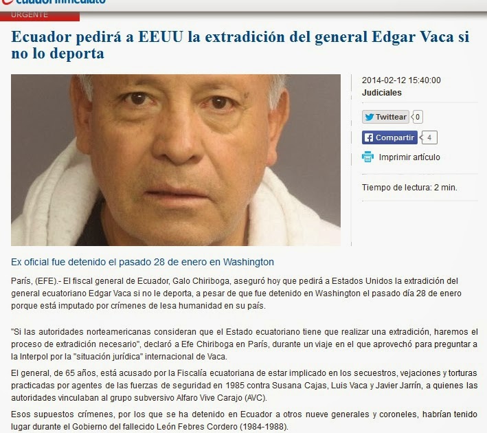 Ecuador pedirá a EE.UU la extradicción del general Edgar Vaca si no lo deporta Feb 13, 2014 | Noticias, Publicaciones | 0 Contenido publicado originalmente en: Ecuadorinmediato ———————————— Monitoreo de medios de comunicación –