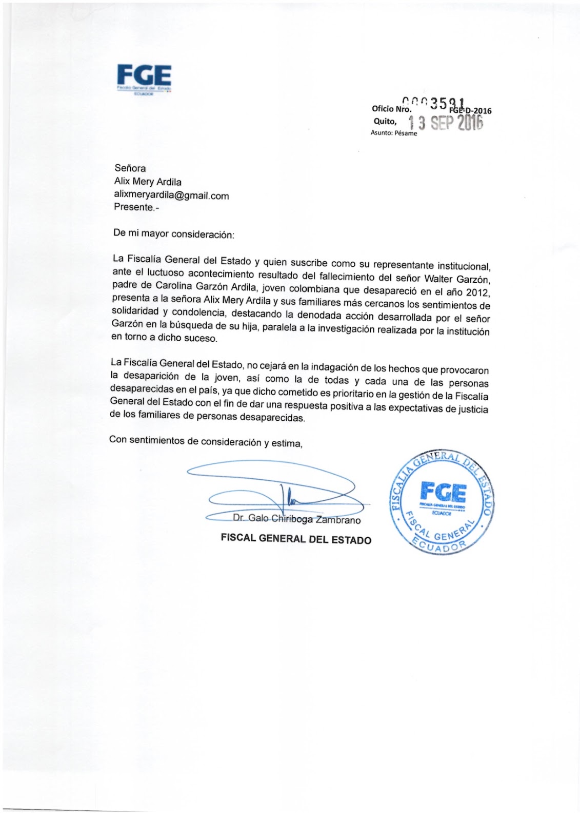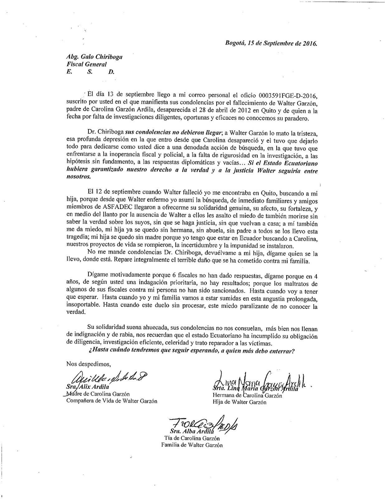 El pasado 13 de septiembre el fiscal Galo Chiriboga envío a la Sra. Alix Mery Ardila una carta de condolencias por el fallecimiento de Walter Garzón.  La familia Garzón Ardila de manera clara, digna y contundente envió su respuesta al Fiscal General.