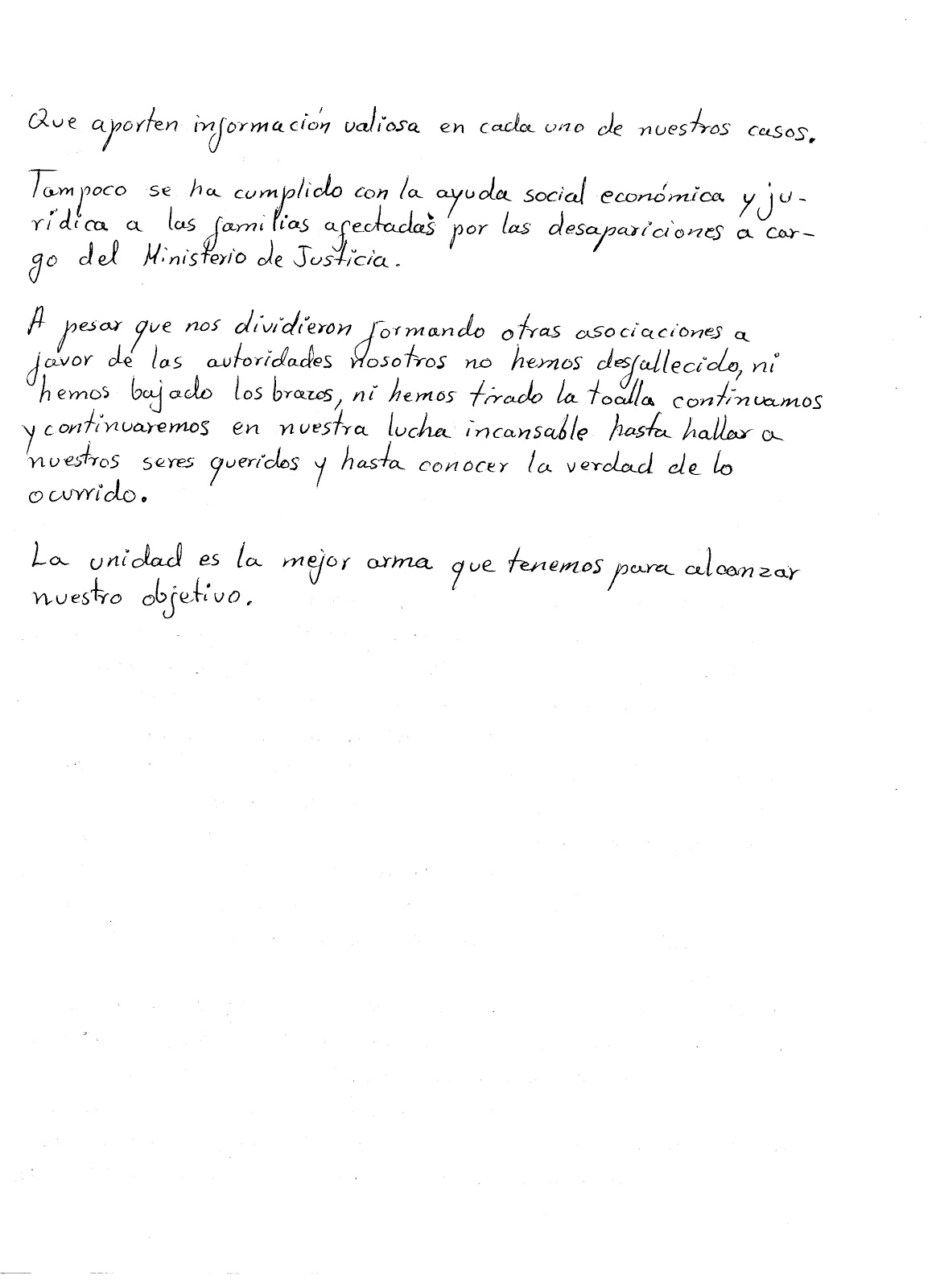 Isabel Cabrera: «La unidad es la mejor arma que tenemos» Jul 2, 2016 | Memoria y Rostros, Noticias, Publicaciones | 0 Carta de Isabel Cabrera que busca a su madre Leonor Ramírez desaparecida el 29 de abril de 2011, en la ciudad de Quito.