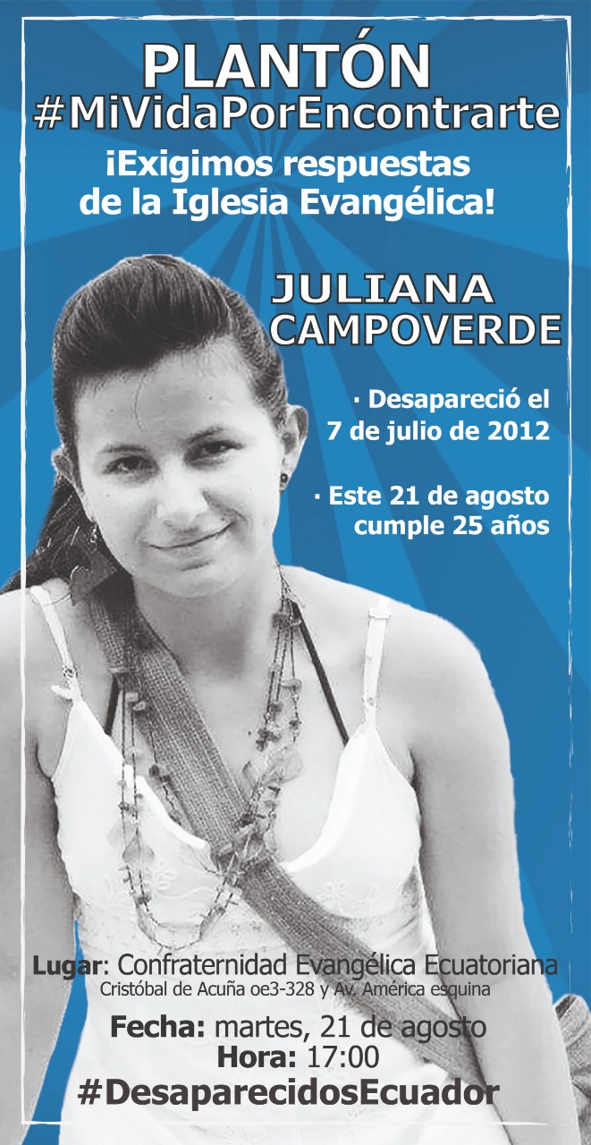 Familia Campoverde Rodríguez y la Asociación de Familiares y Amigos de Personas Desaparecidas en Ecuador (Asfadec) invitan a los familiares, amigos, periodistas y a la sociedad en general al plantón «Mi vida por encontrarte» que se realizará este martes, 21 de agosto de 2018, fecha en que Juliana Campoverde Rodríguez, joven desaparecida el 7 de julio de 2012, en el sur de Quito, cumple 25 años.