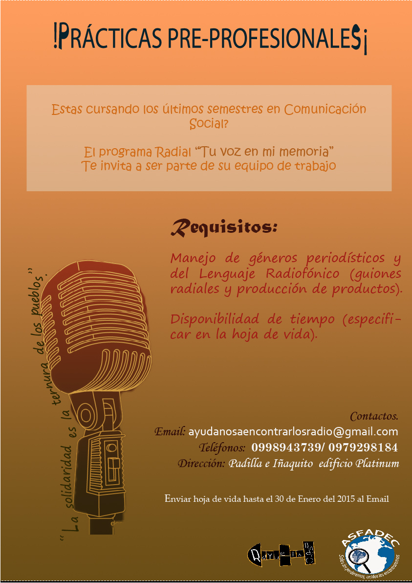 A los interesados/as enviar hoja de vida hasta el 30 de enero del 2016 al correo ayudanosaencontrarlosradio@gmail.com